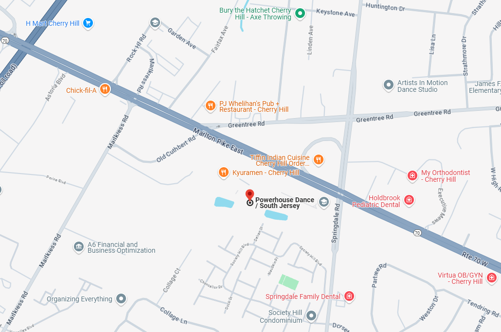 Google Maps: Enter 1873 Marlton Pike East or Powerhouse Dance. If entering Powerhouse Dance, be aware it may also provide an option for our old address.