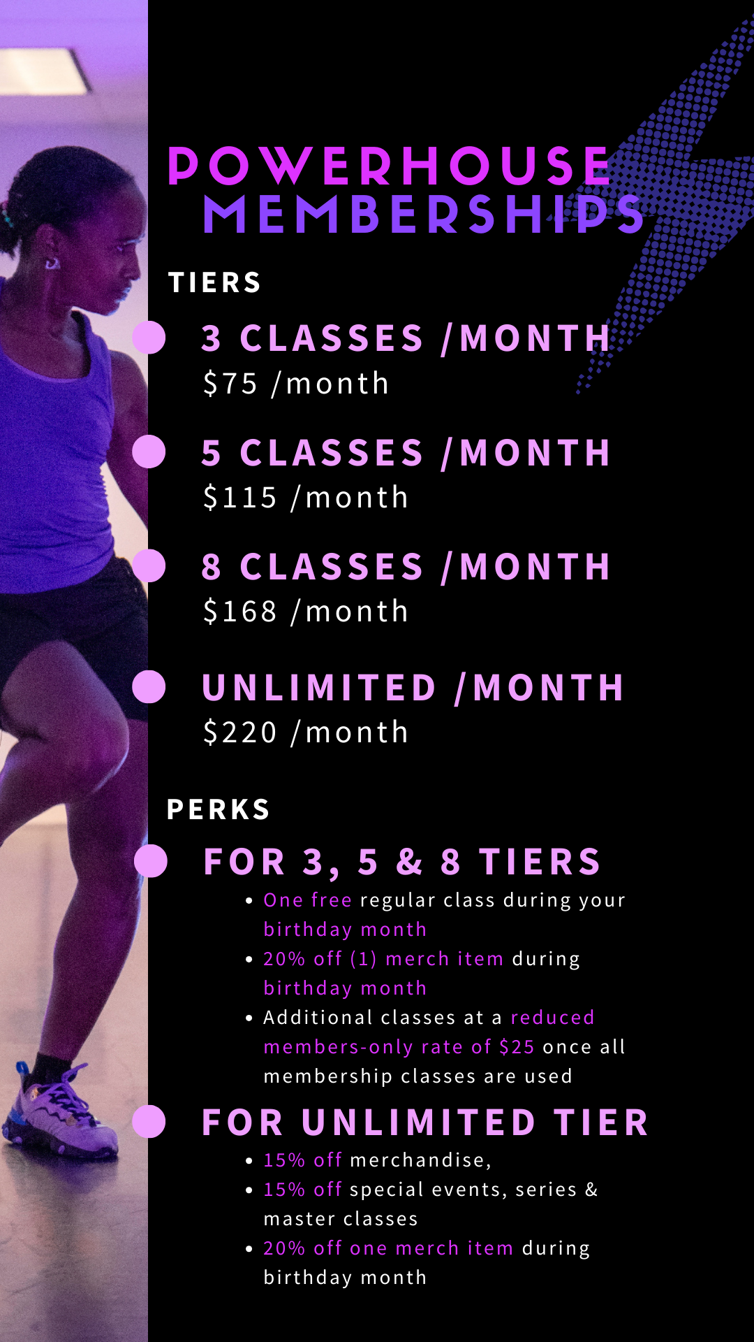 Once you use all your membership passes in one month, you can purchase additional classes through a Powerhouse team member for $25.