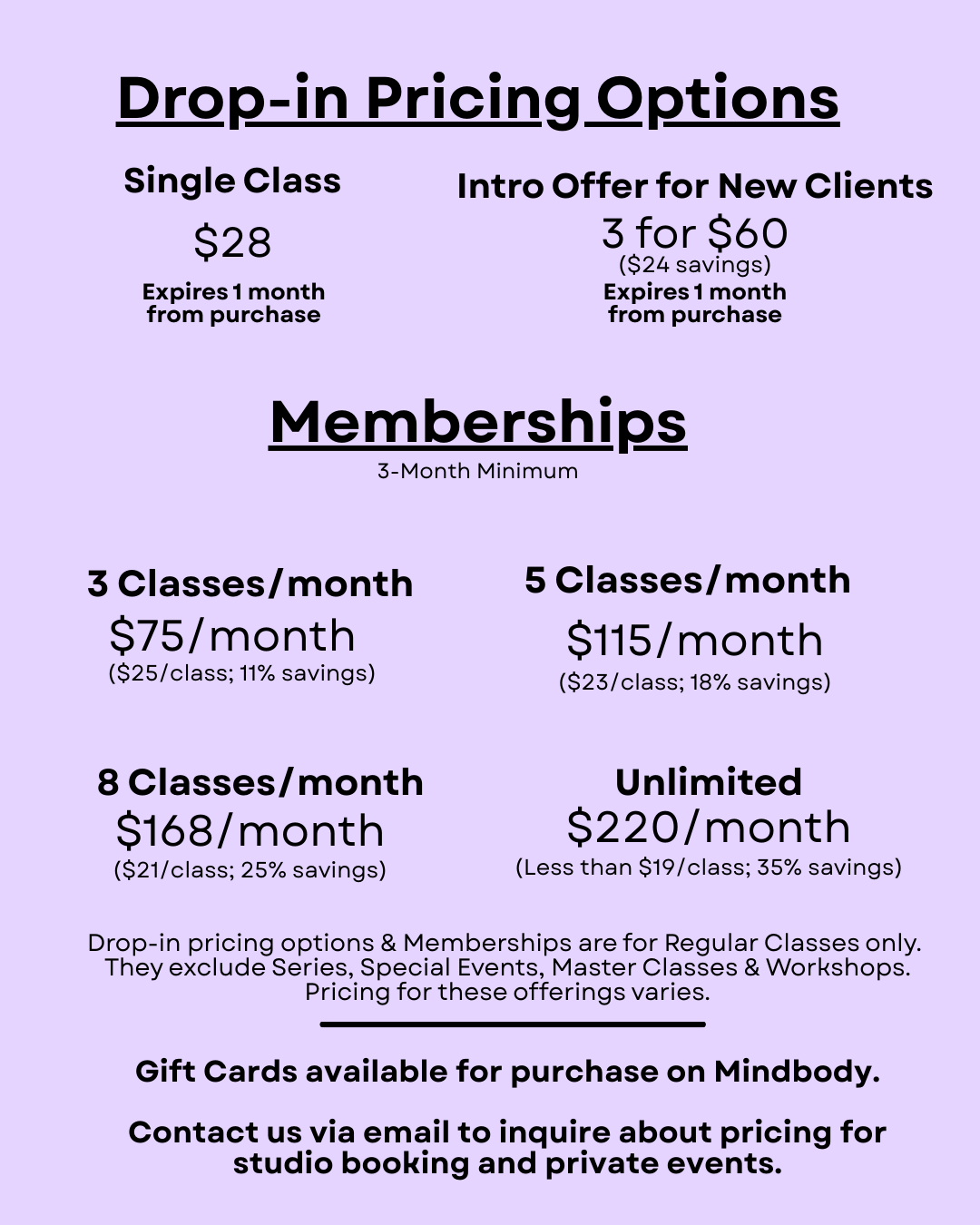 Memberships can only be purchased on the Mindbody website, and are not available on the Mindbody mobile app. All memberships include Regular classes only. Special events, master classes, series, and workshops are not included in memberships and must be purchased separately (though unlimited membership holders receive a special discount). Click on the links below to purchase!