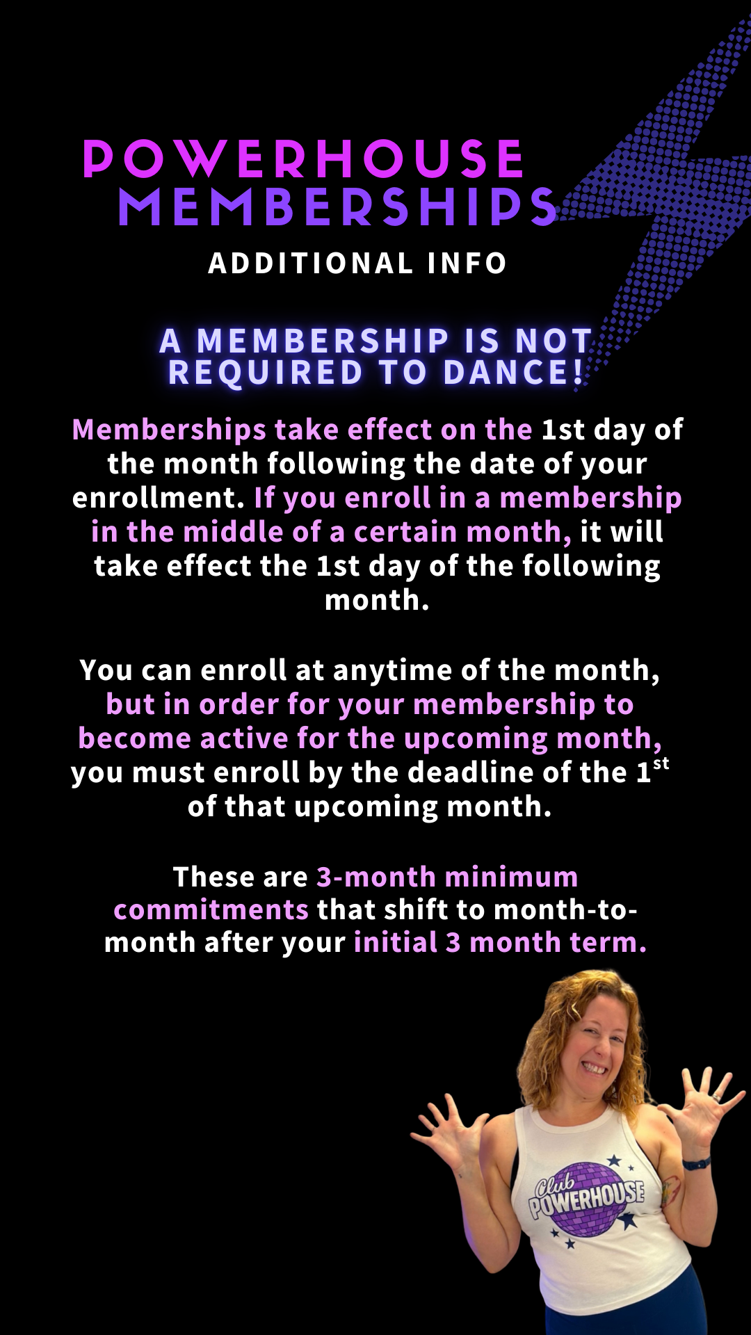 Memberships take effect on the 1st day of the month following the date of your enrollment. You can enroll in a membership any time, however be sure to enroll in it by the first day of the month you want it to be effective. If you enroll in a membership in the middle of a certain month, it will take effect the 1st day of the following month. This is noted in your terms and conditions, but please read all terms carefully and reach out to us with any questions prior to enrolling.
